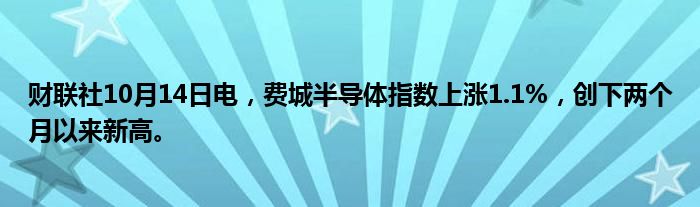 财联社10月14日电,费城半导体指数上涨1.1%,创下两个月以来新高。